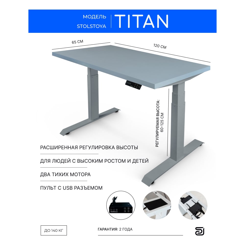Стол двухмоторный с регулируемой высотой StolStoya ТИТАН подстолье серое и столешница МДФ эмаль SE221ISS12065