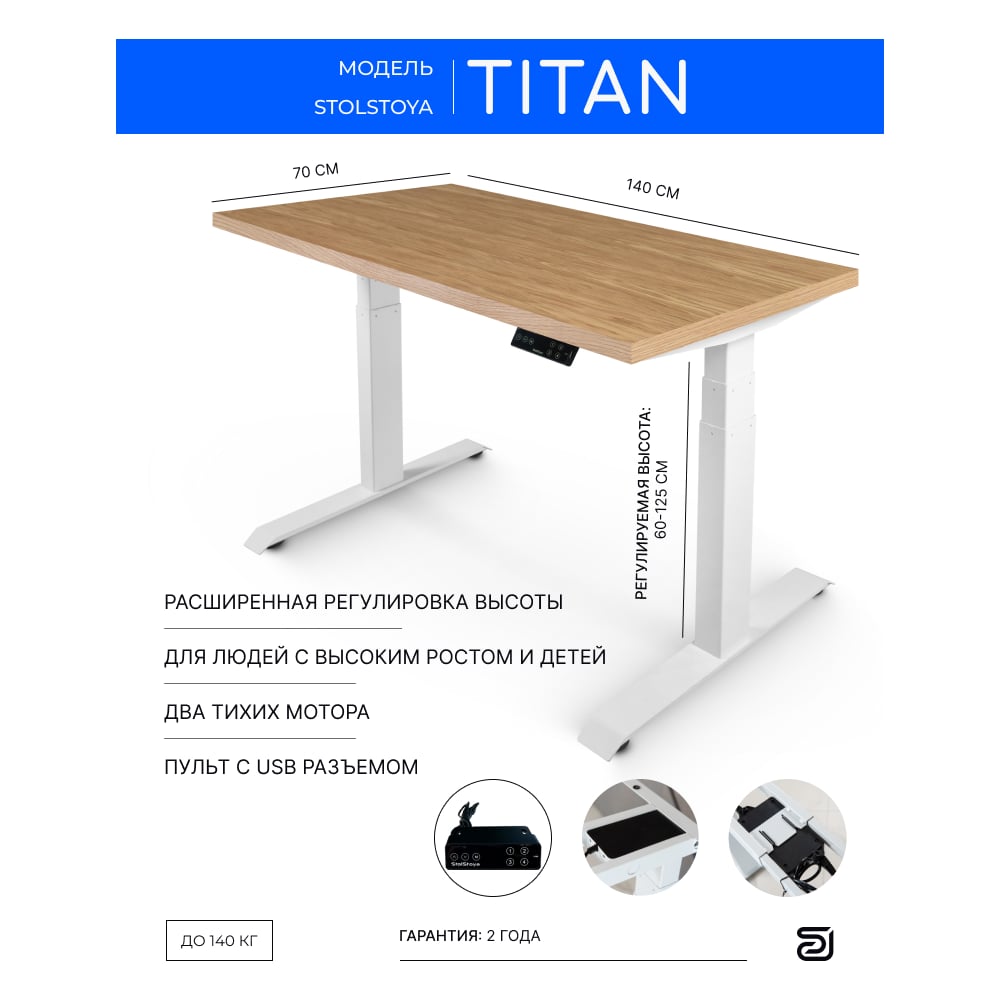 Стол двухмоторный с регулируемой высотой StolStoya ТИТАН подстолье белое и столешница МДФ шпон Дуб SE221IWDE14070