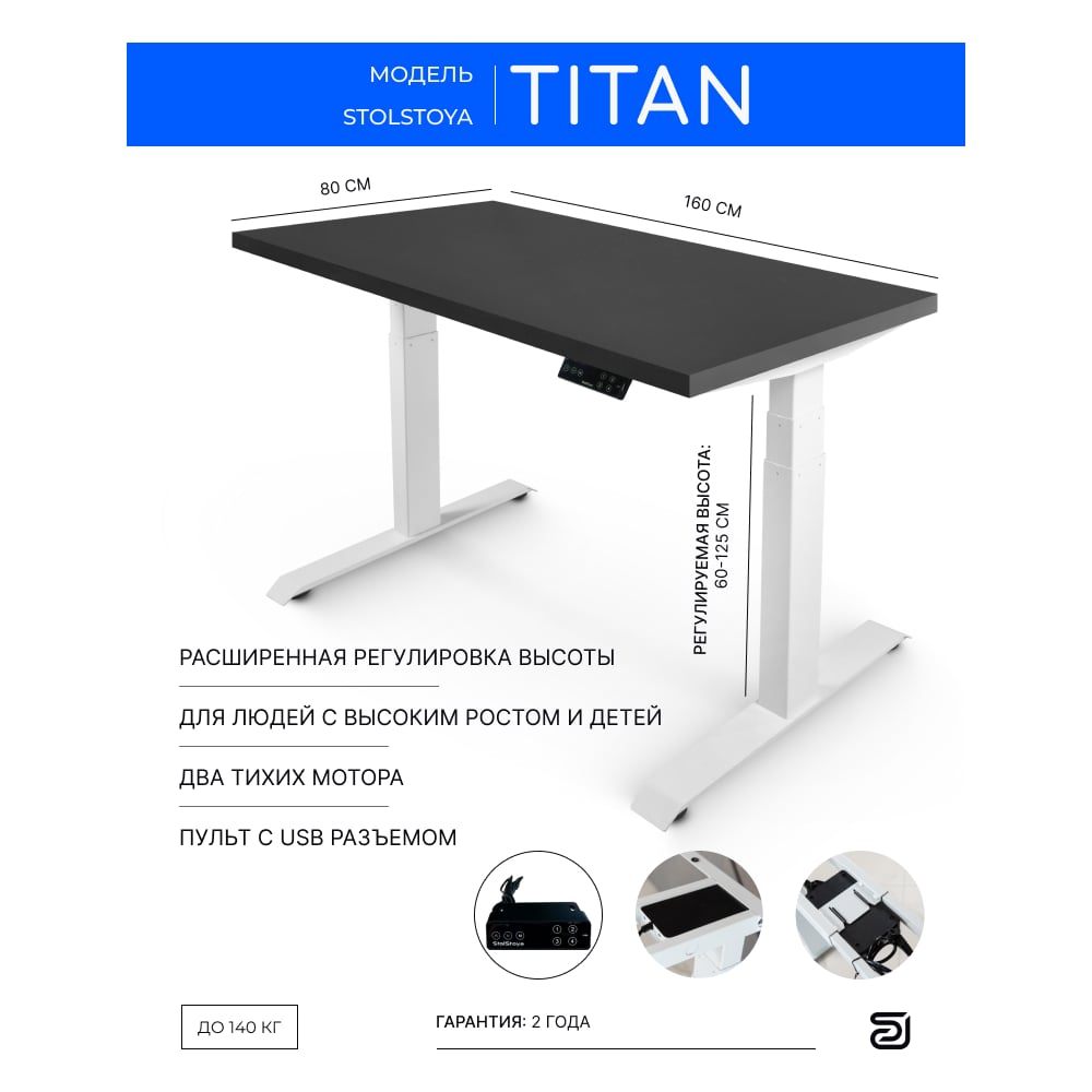 Стол с регулируемой высотой StolStoya ТИТАН 160x80 см, рама белая, столешница МДФ, эмаль черная SE221IWB16080