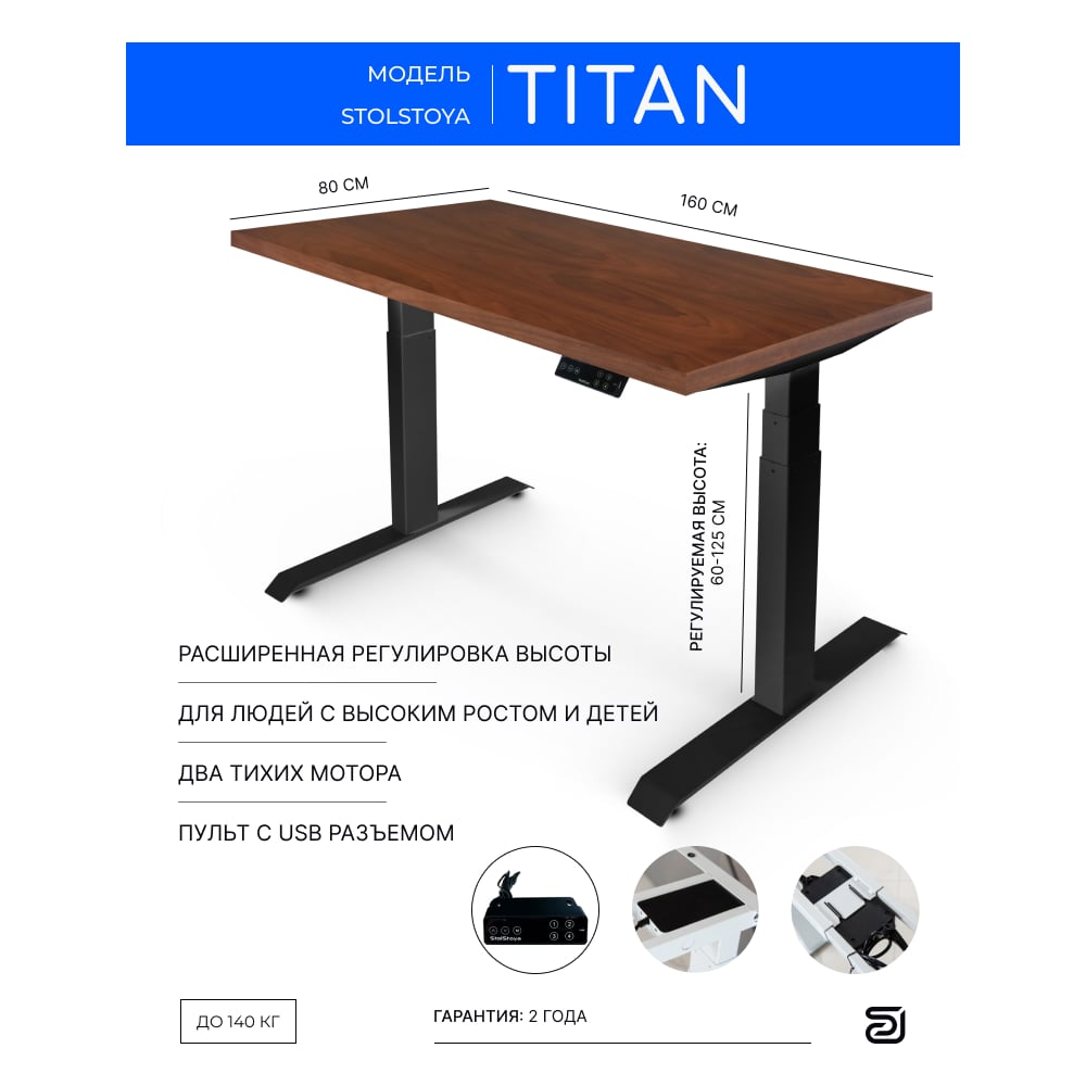 Стол с регулируемой высотой StolStoya ТИТАН 160x80 см, рама черная, столешница МДФ, шпон, американский орех SE221IBAO16080