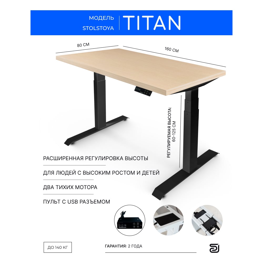 Стол с регулируемой высотой StolStoya ТИТАН 160x80 см, рама черная, столешница МДФ, шпон, беленый дуб SE221IBBD16080