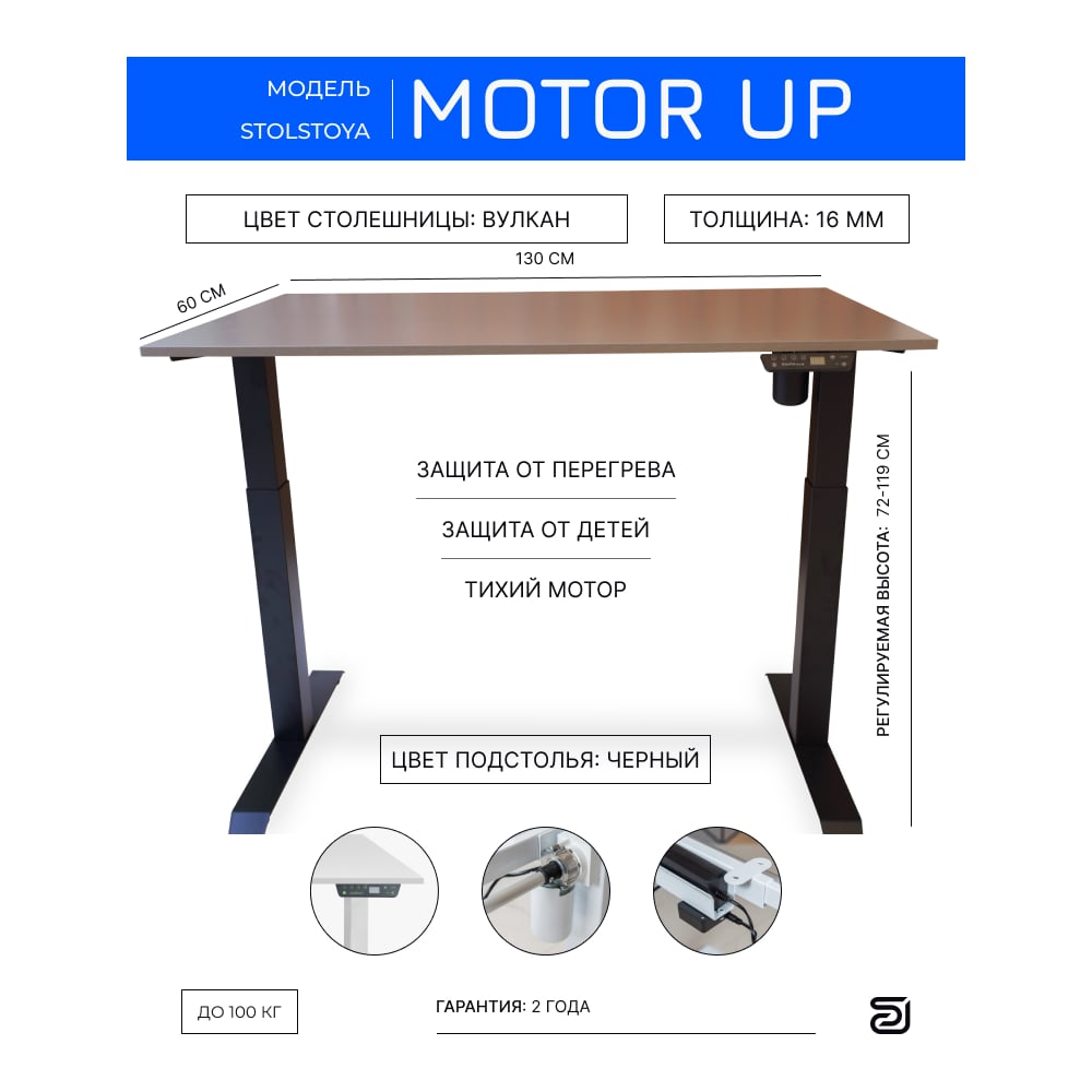 Стол с регулируемой высотой StolStoya МОТОР UP рама черная, столешница ЛДСП, Вулкан, 130x60 PE211IBSLS130