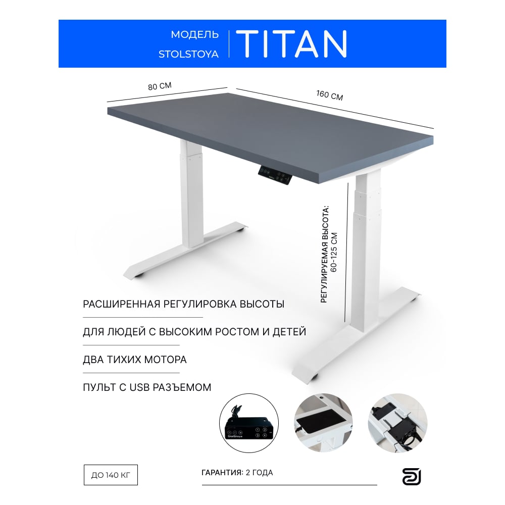 Стол с регулируемой высотой StolStoya ТИТАН рама белая, столешница МДФ, эмаль сланцево-серая, 160x80 SE221IWSS16080