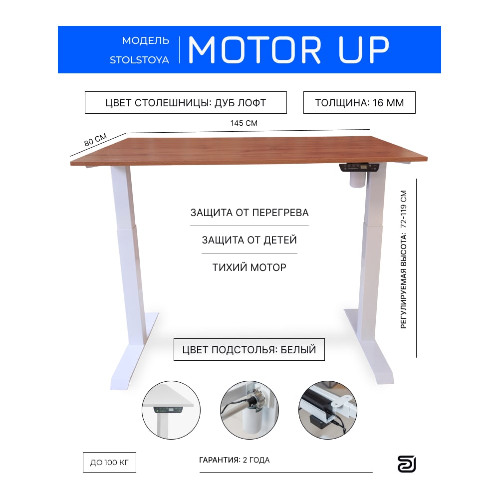Стол с регулируемой высотой StolStoya МОТОР UP рама белая, столешница ЛДСП, Дуб лофт, 145x80 PE211IWSLDL145