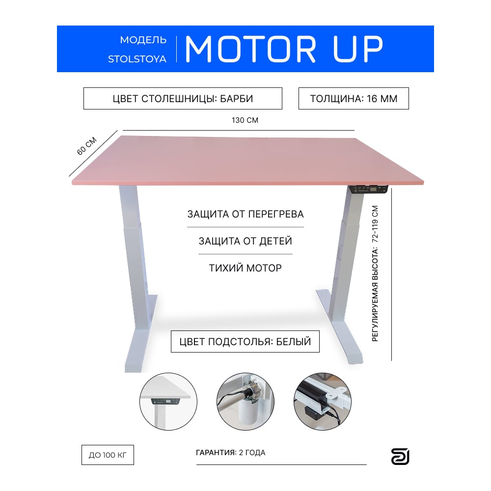 Стол с регулируемой высотой StolStoya МОТОР UP рама белая, столешница ЛДСП, Барби, 130x60 PE211IWSLBB130