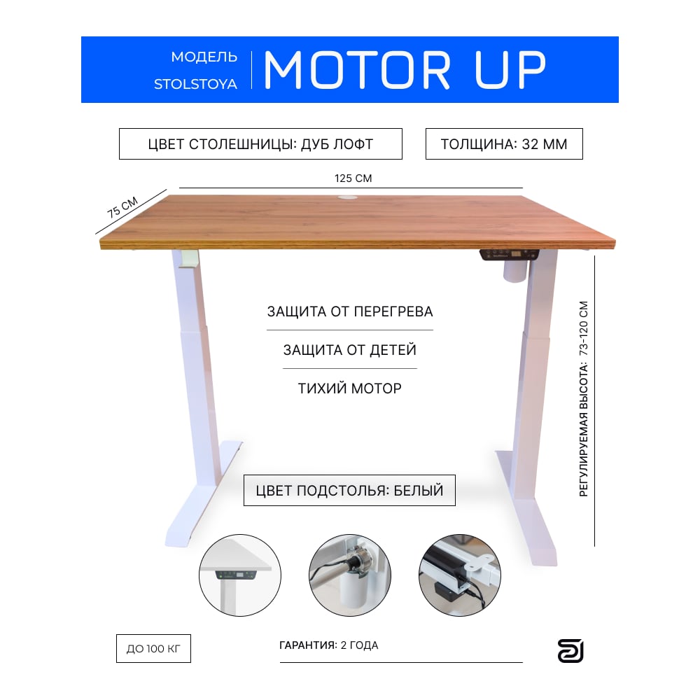 Стол с регулируемой высотой StolStoya МОТОР UP рама белая, столешница ЛДСП, Дуб лофт, 125x75 PE211IWSLDL125