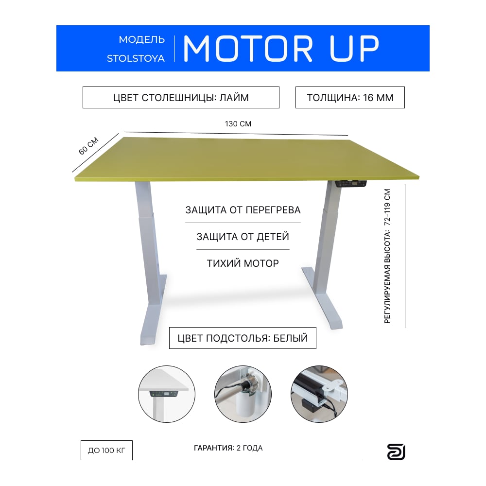 Стол с регулируемой высотой StolStoya МОТОР UP рама белая, столешница ЛДСП, Лайм, 130x60 PE211IWSLSL130
