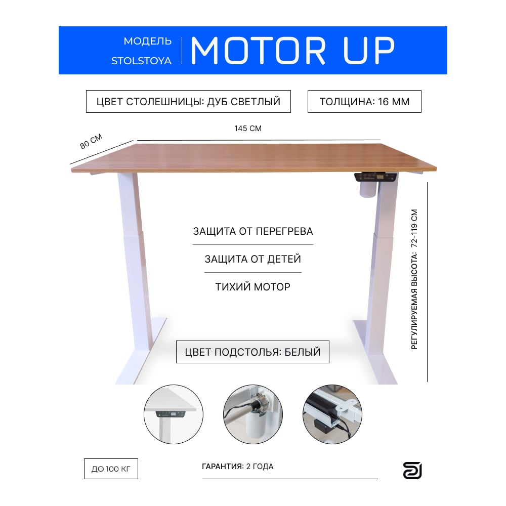 Стол с регулируемой высотой StolStoya МОТОР UP рама белая, столешница ЛДСП, Дуб светый, 145x80 PE211IWSLDS145