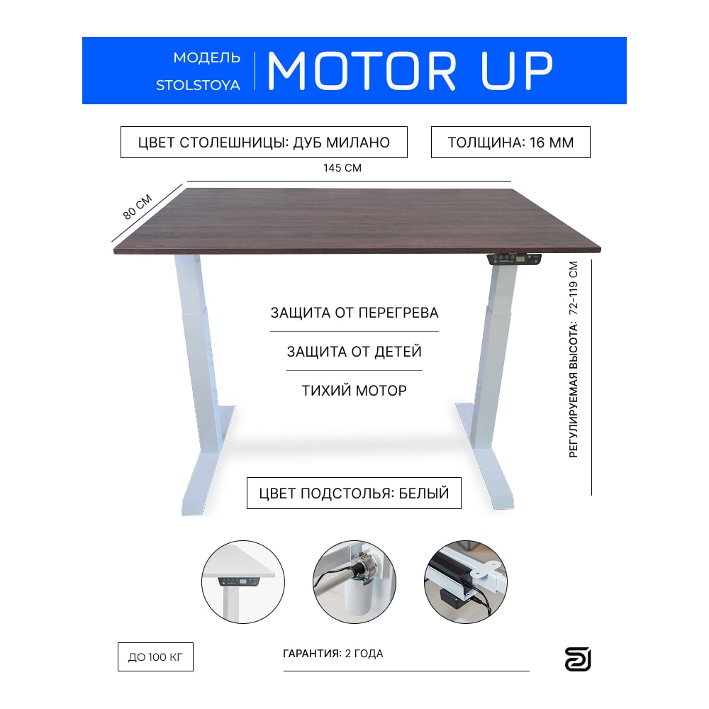Стол с регулируемой высотой StolStoya МОТОР UP рама белая, столешница ЛДСП, Дуб Милано, 145x80 PE211IWSLDM145