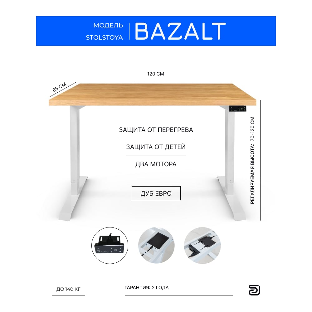 Стол с электрической регулировкой высоты StolStoya BAZALT рама белая, столешница мдф дуб европейский (шпон), 120x65 SE222W120E