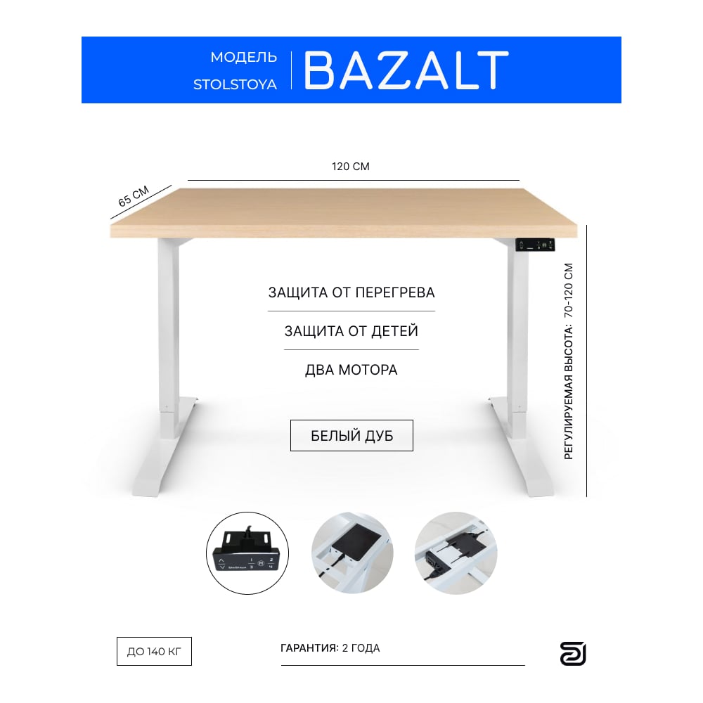 Стол с электрической регулировкой высоты StolStoya BAZALT рама белая, столешница МДФ беленый дуб (шпон) 120x65 SE222W120BD
