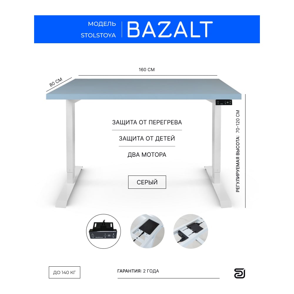 Стол с электрической регулировкой высоты StolStoya BAZALT рама белая, столешница мдф серая (эмаль), 160x80 SE222W160S