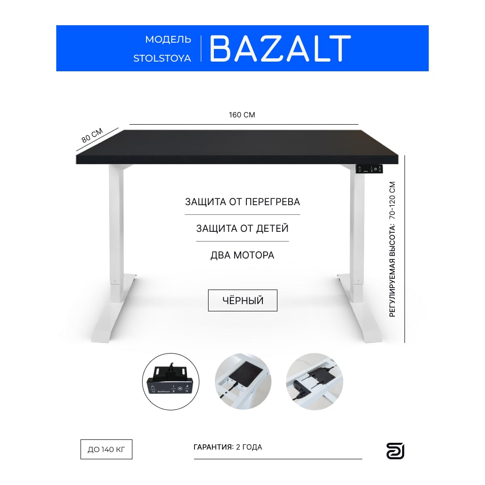 Стол с электрической регулировкой высоты StolStoya BAZALT рама белая, столешница мдф черная (эмаль), 160x80 SE222W160B