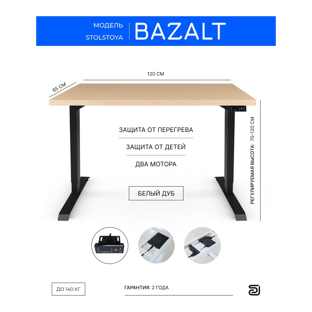Стол с электрической регулировкой высоты StolStoya BAZALT рама черная, столешница мдф беленый дуб (шпон), 120x65 SE222B120BD