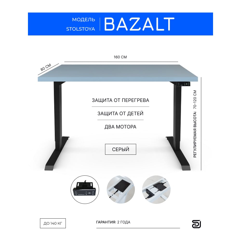 Стол с электрической регулировкой высоты StolStoya BAZALT рама черная, столешница мдф серая (эмаль), 160x80 SE222B160S