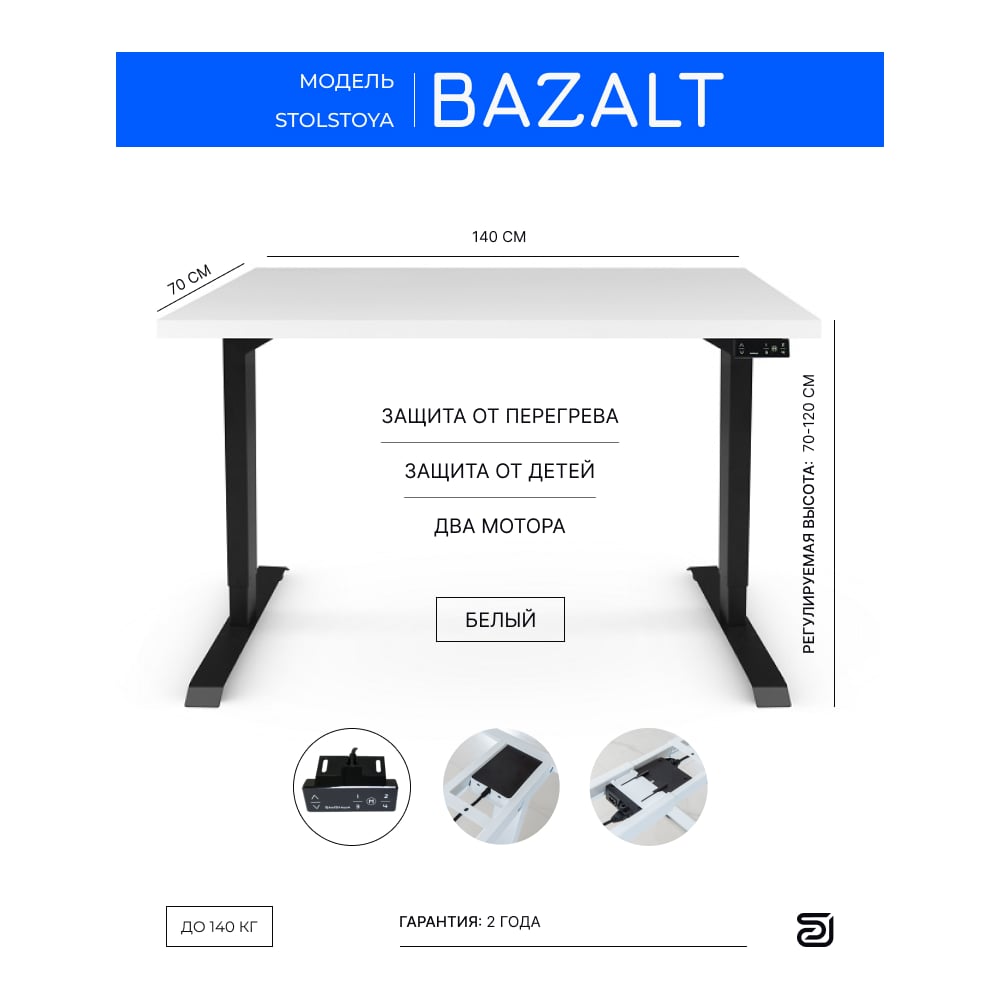 Стол с электрической регулировкой высоты StolStoya BAZALT рама черная, столешница мдф белая (эмаль), 140x70 SE222B140W