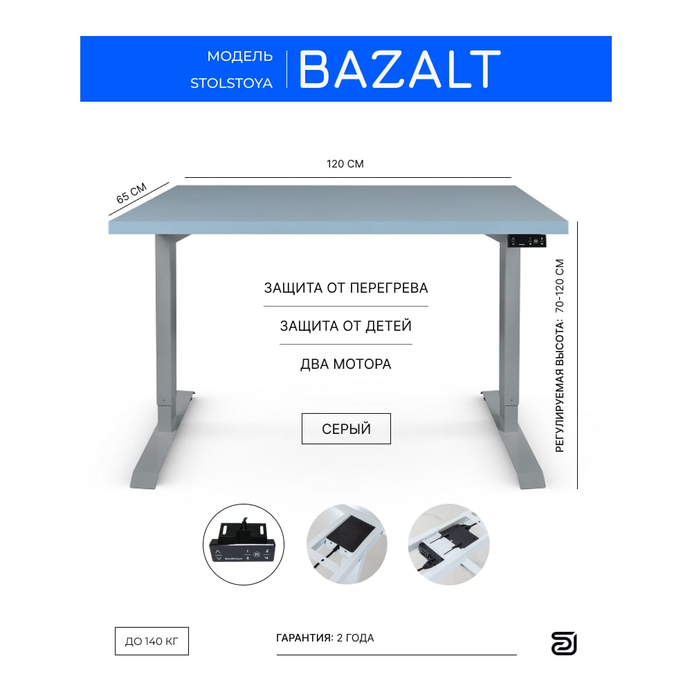 Стол с электрической регулировкой высоты StolStoya BAZALT рама серая, столешница мдф серая (эмаль), 120x65 SE222S120S