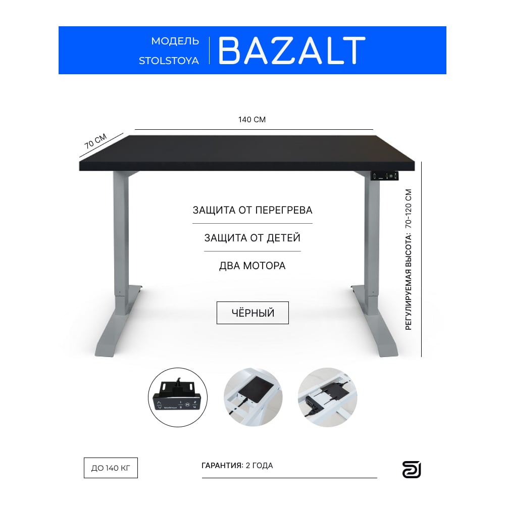 Стол с электрической регулировкой высоты StolStoya BAZALT рама серая, столешница мдф черная (эмаль), 140x70 SE222S140B