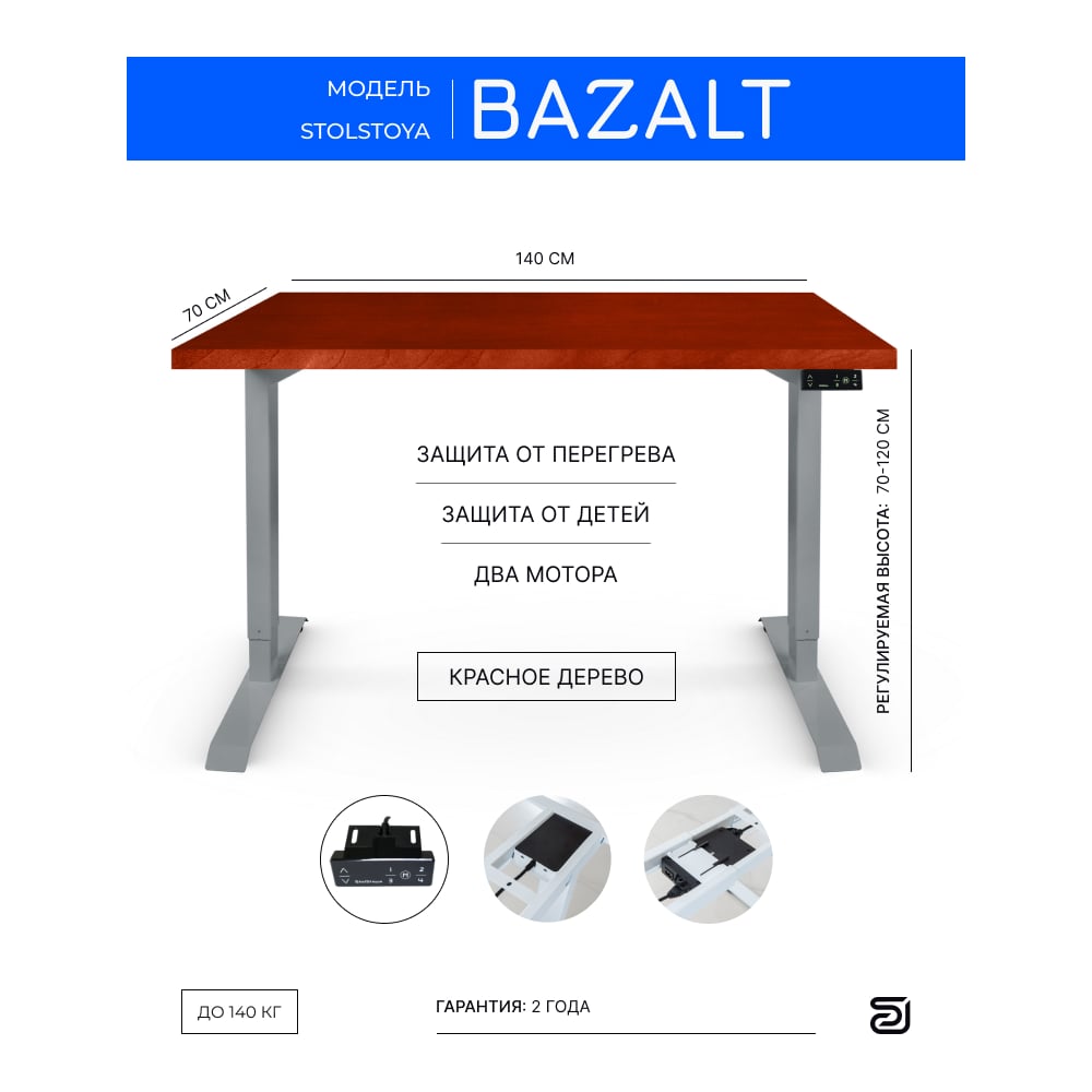Стол с электрической регулировкой высоты StolStoya BAZALT рама серая, столешница мдф красное дерево (шпон), 140x70 SE222S140KD