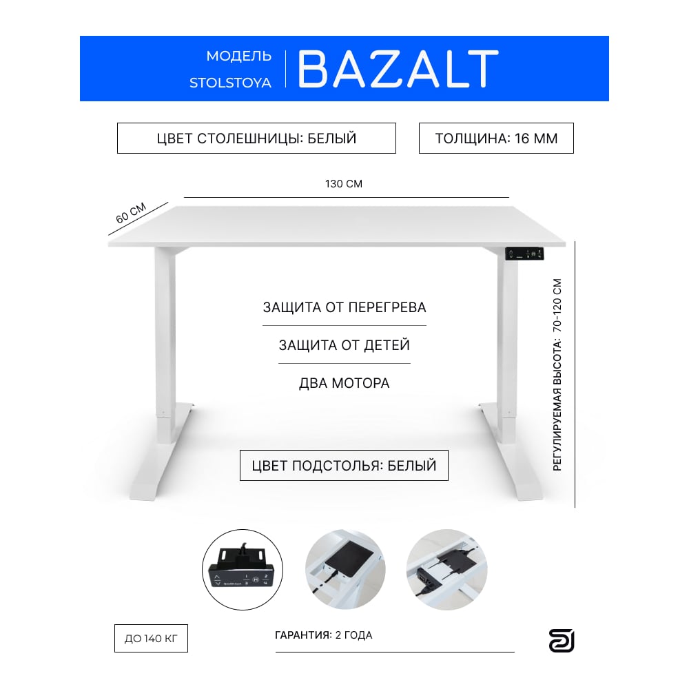 Письменный, компьютерный стол для работы сидя и стоя StolStoya BAZALT белый, регулируемый, с электроприводом, столешница лдсп белая, 130x60 SE222WW13060