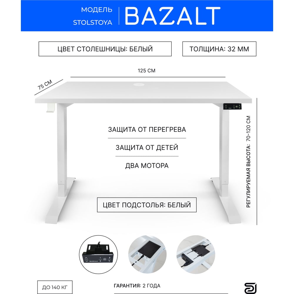 Письменный, компьютерный стол для работы сидя и стоя StolStoya BAZALT белый, регулируемый, с электроприводом, столешница лдсп белая,125x75 SE222WW12575