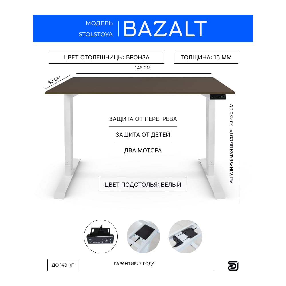 Письменный, компьютерный стол для работы сидя и стоя StolStoya BAZALT белый, регулируемый, с электроприводом, столешница лдсп бронза, 145x80 SE222WC14580