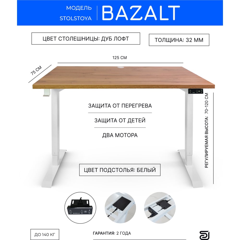 Письменный, компьютерный стол для работы сидя и стоя StolStoya BAZALT белый, регулируемый, с электроприводом, столешница лдсп дуб лофт, 125x75 SE222WDl12575