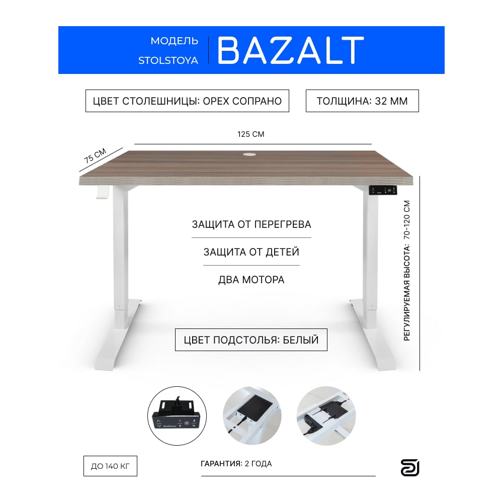 Письменный, компьютерный стол для работы сидя и стоя StolStoya BAZALT, белый, с электроприводом, столешница лдсп орех сопрано 125x75 SE222WOS12575