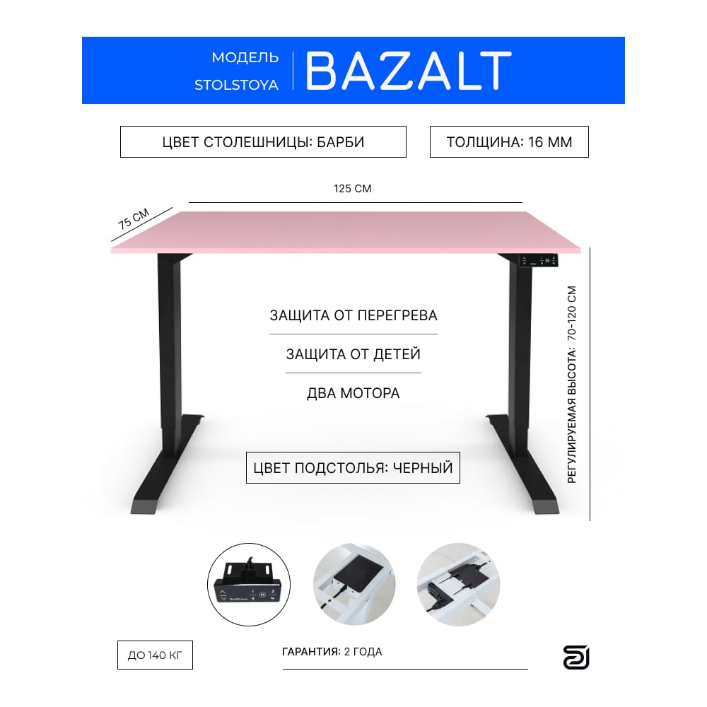 Письменный, компьютерный стол для работы сидя и стоя StolStoya BAZALT, черный, с электроприводом, столешница лдсп барби 125x75 SE222Bbr12575
