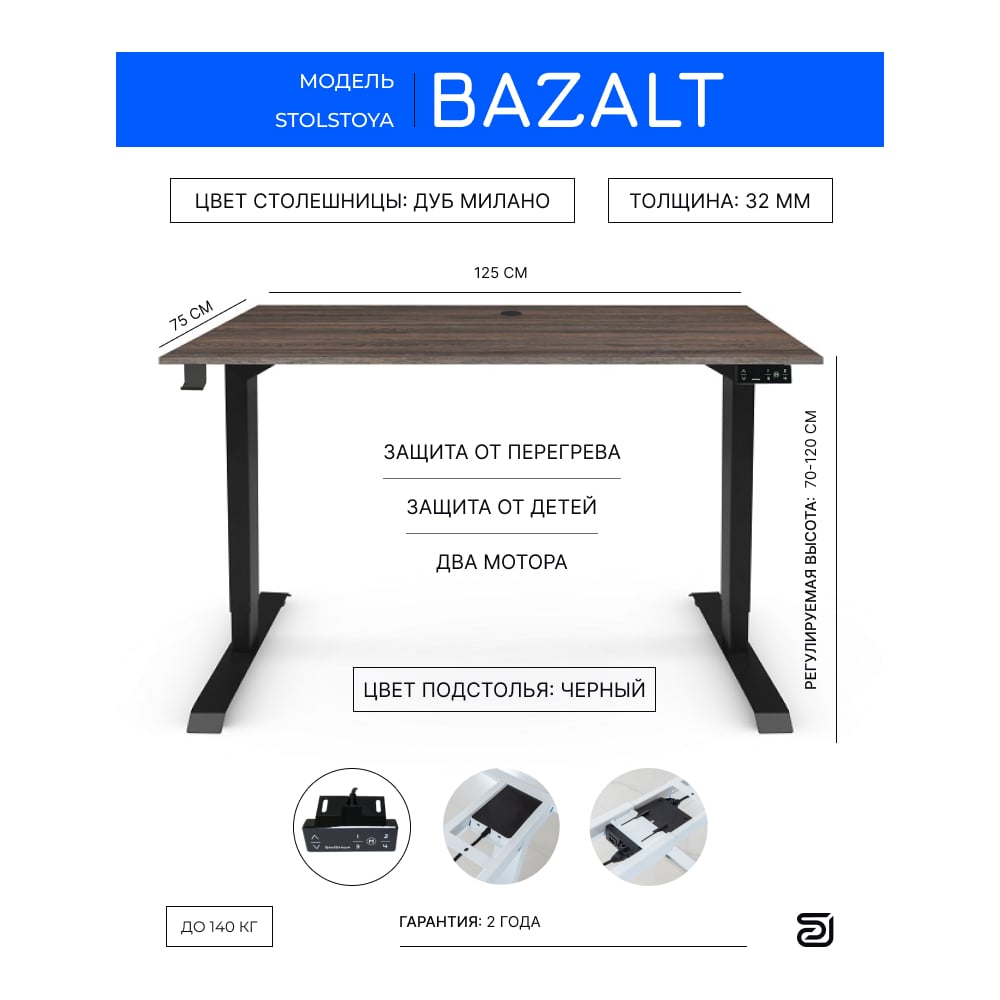 Письменный, компьютерный стол для работы сидя и стоя StolStoya BAZALT черный, регулируемый, с электроприводом, столешница лдсп дуб милано 125x75 SE222BM12575