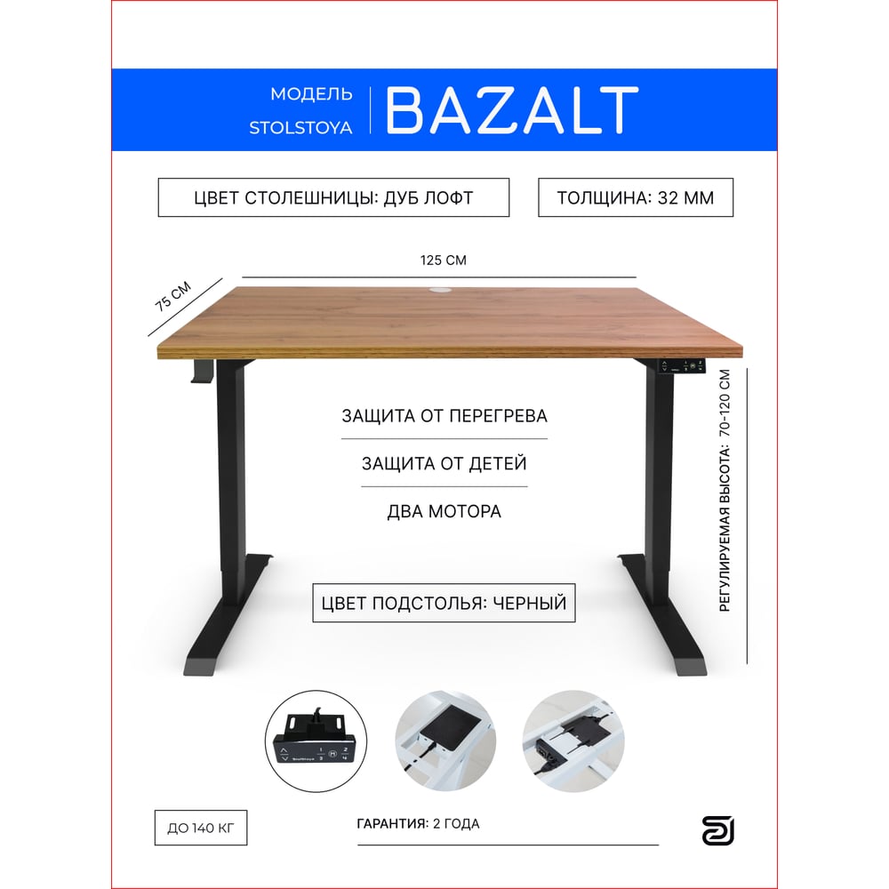 Письменный, компьютерный стол для работы сидя и стоя StolStoya BAZALT черный, регулируемый, с электроприводом, столешница лдсп дуб лофт 125x75 SE222BDl12575