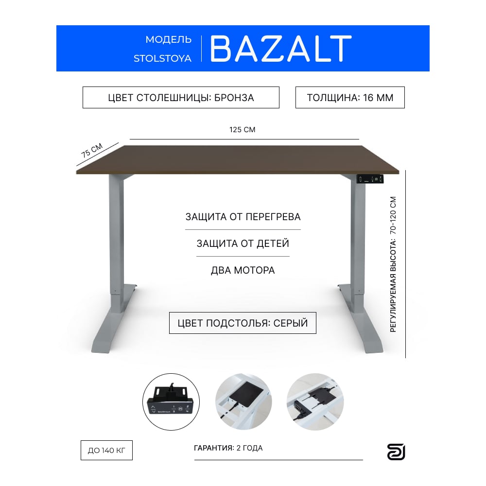 Письменный, компьютерный стол для работы сидя и стоя StolStoya BAZALT серый, регулируемый, с электроприводом, столешница лдсп бронза 125x75 SE222SC12575