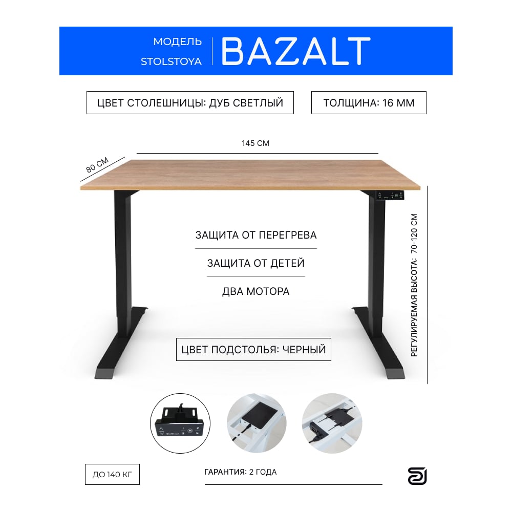 Письменный, компьютерный стол для работы сидя и стоя StolStoya BAZALT черный, регулируемый, с электроприводом, столешница лдсп дуб светлый 145x80 SE222BDs14580