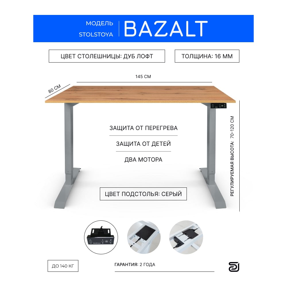 Письменный, компьютерный стол для работы сидя и стоя StolStoya BAZALT серый, регулируемый, с электроприводом, столешница лдсп дуб лофт 145x80 SE222SDl14580