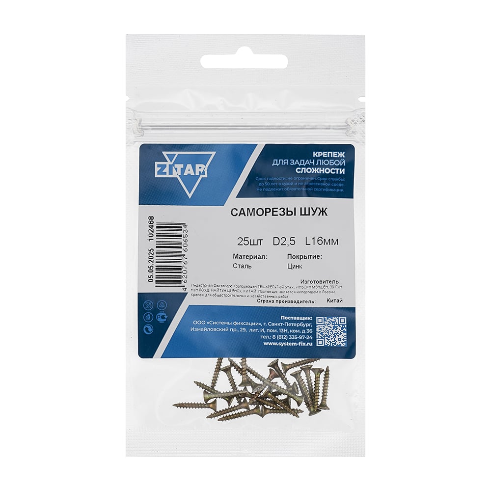 Саморез ШУж с потайной головкой, 2,5x16 мм, 25 шт., пакет Zitar 102468