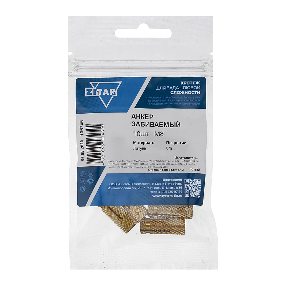 Забиваемый латунный анкер М8, 10 шт, пакет Zitar 106745
