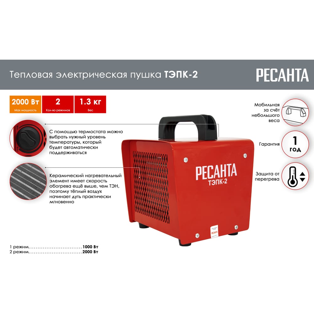 Тепловая электрическая пушка Ресанта АКЦИЯ ТЭПК-2 керамический нагревательный элемент, квадратный корпус 67/1/40