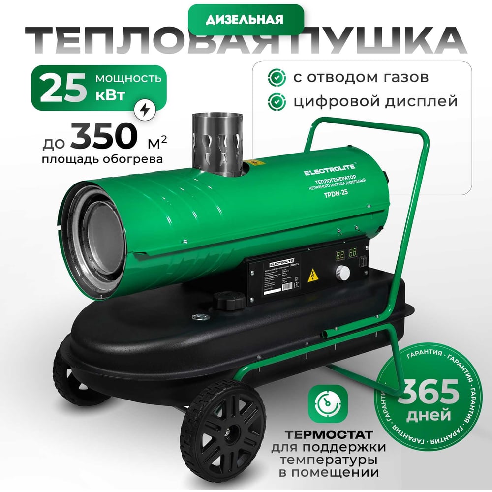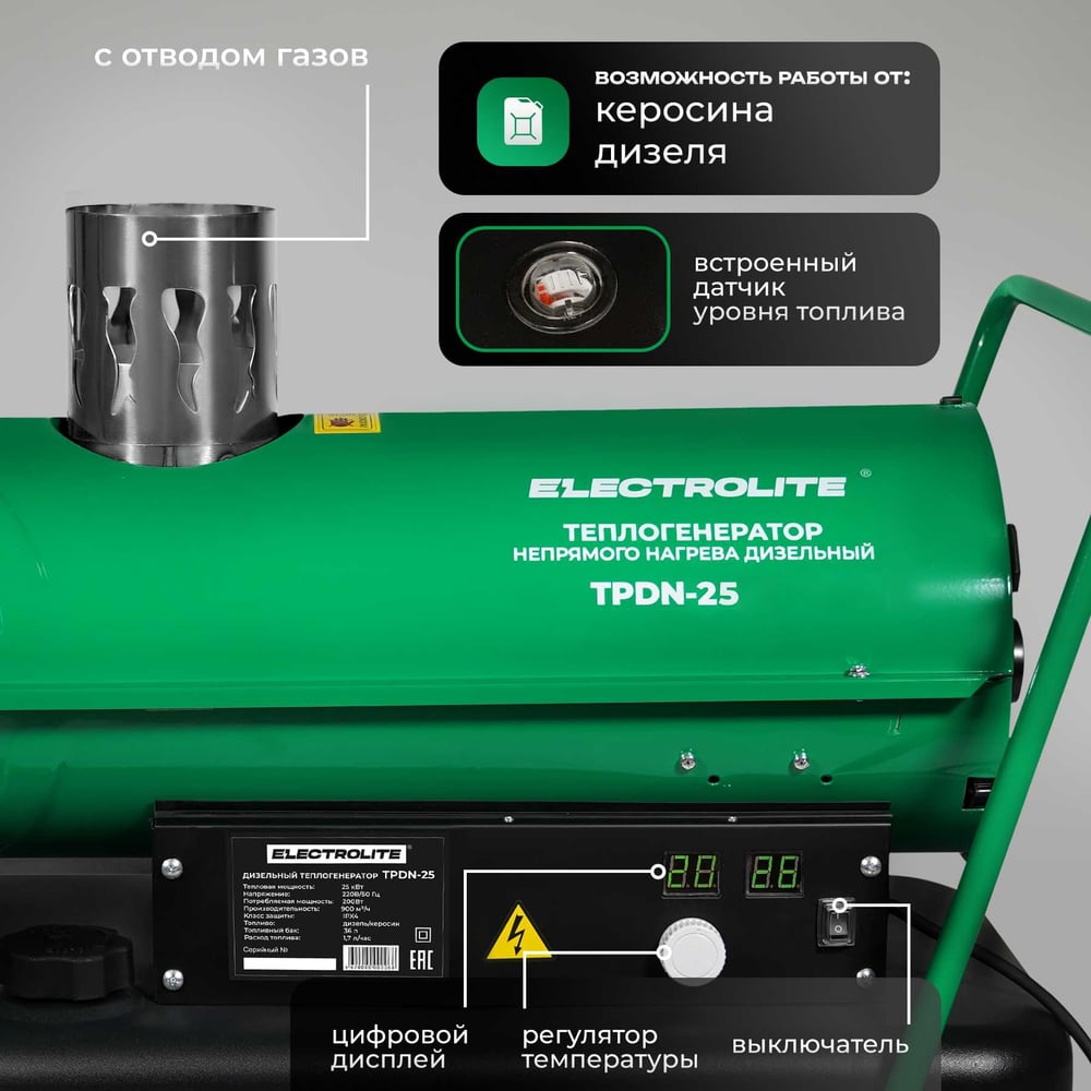 Тепловая дизельная пушка Electrolite TPDN-25 EL ( 25000 Вт, 900 м3/час, 1.7 л/час, 36 л бак, НЕПРЯМОЙ НАГРЕВ) 4094