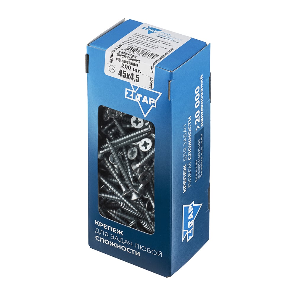 Универсальный саморез Zitar 45х4,5 мм 200 шт оцинкованный, коробка с окном 102192
