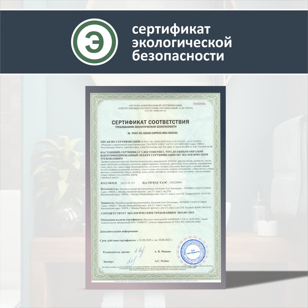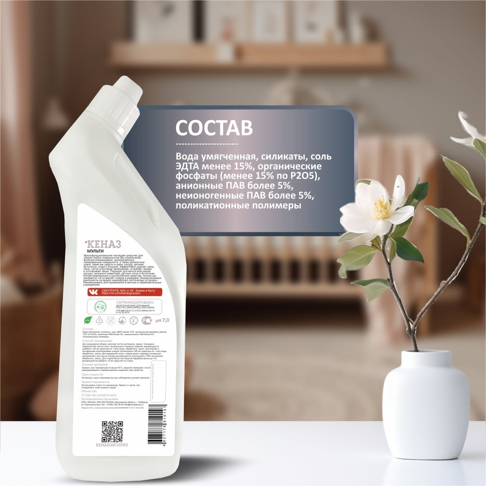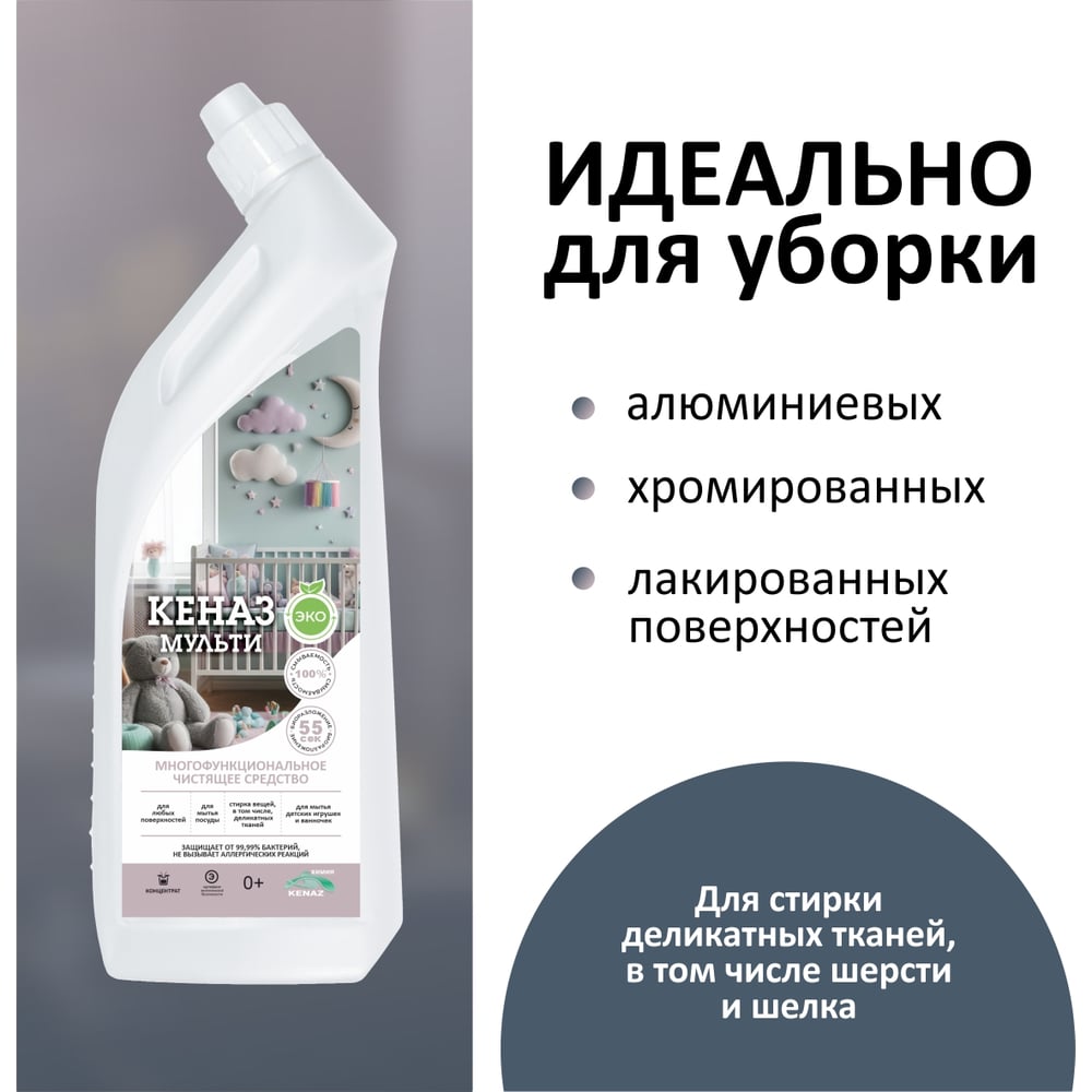 Средство для очистки различных поверхностей КЕНАЗ мульти, для мытья пола, для выведения пятен вина, чистка мебели, 0.8 л 810147