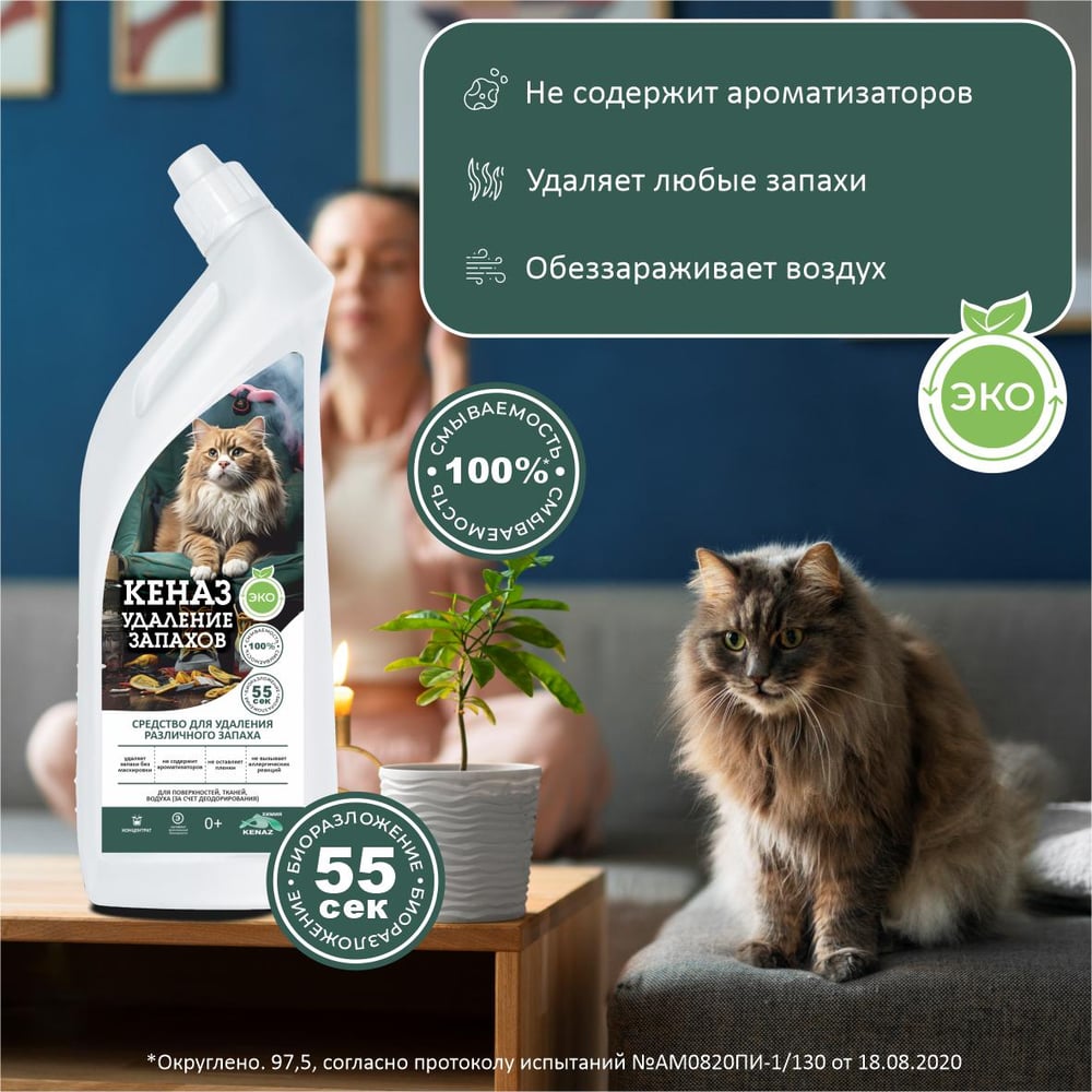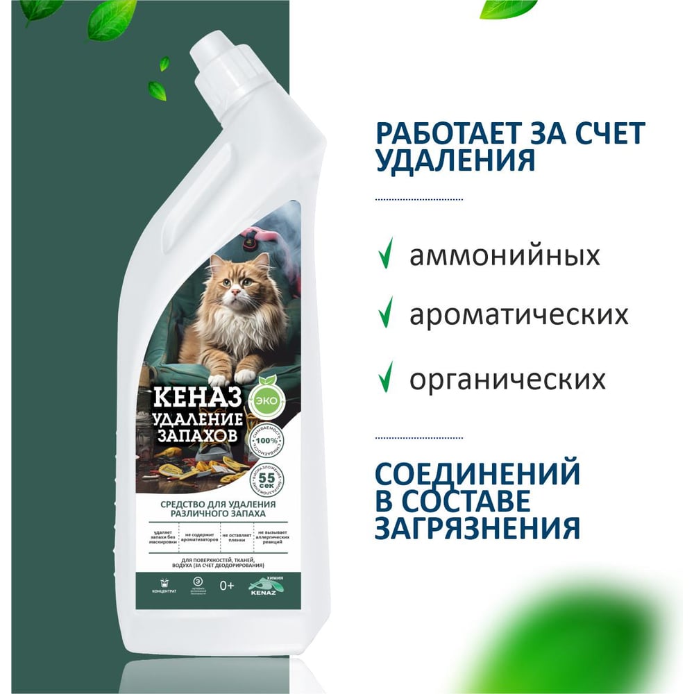 Поглотитель неприятного запаха КЕНАЗ средство для уборки, удаление запахов животных, 0.8 л 809868 995340