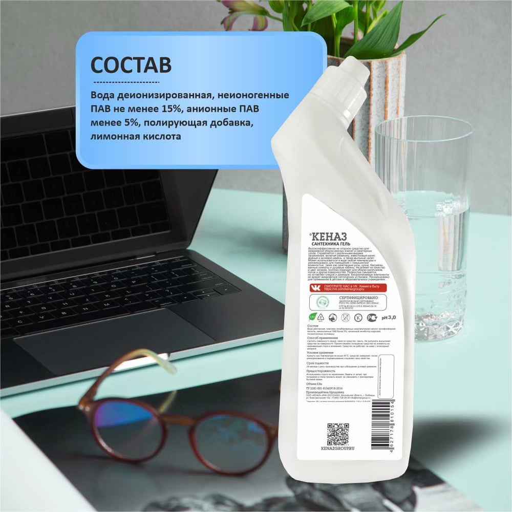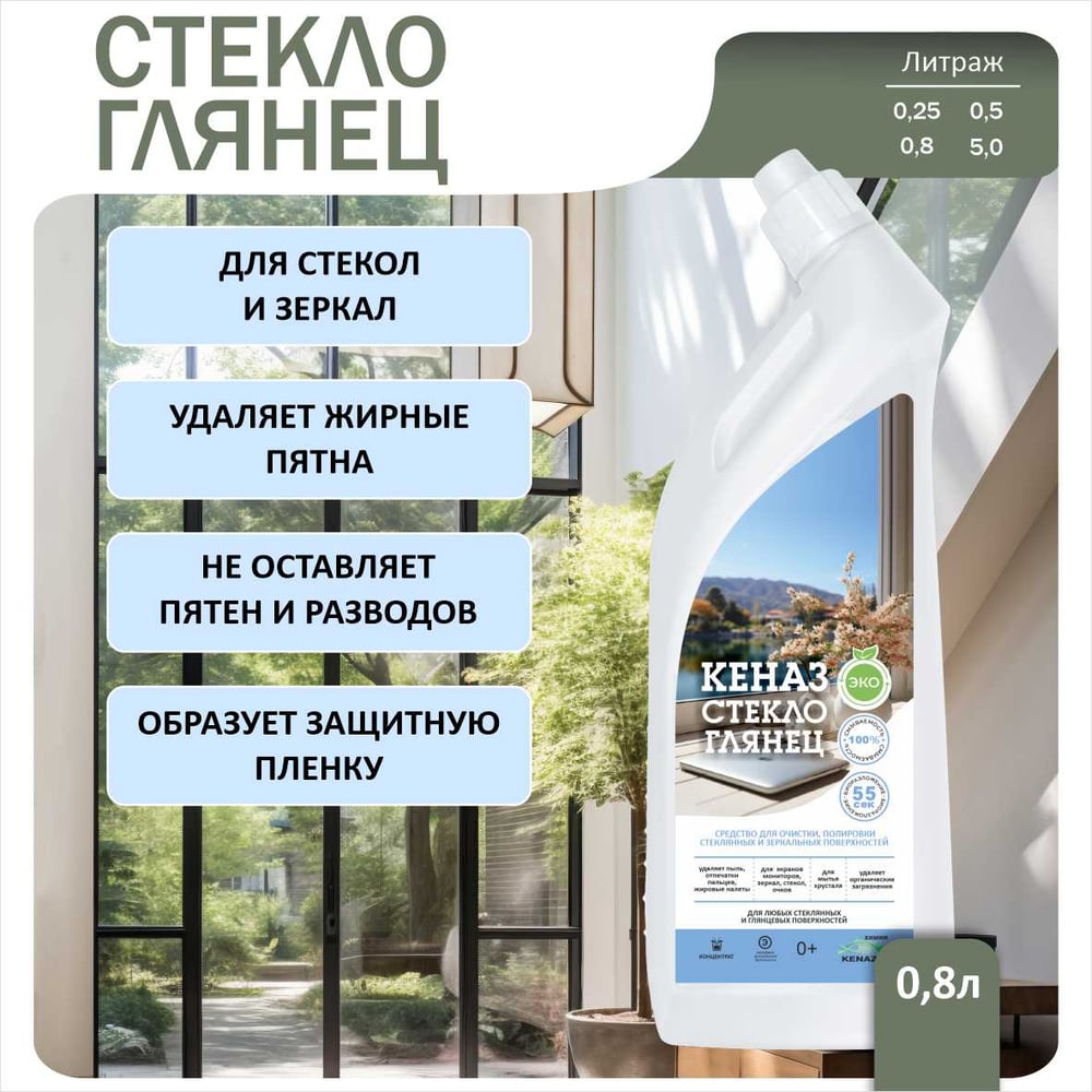 Средство для окон, для мытья стекол и зеркал КЕНАЗ стекло глянец, без разводов и царапин, 0.8 л 809950