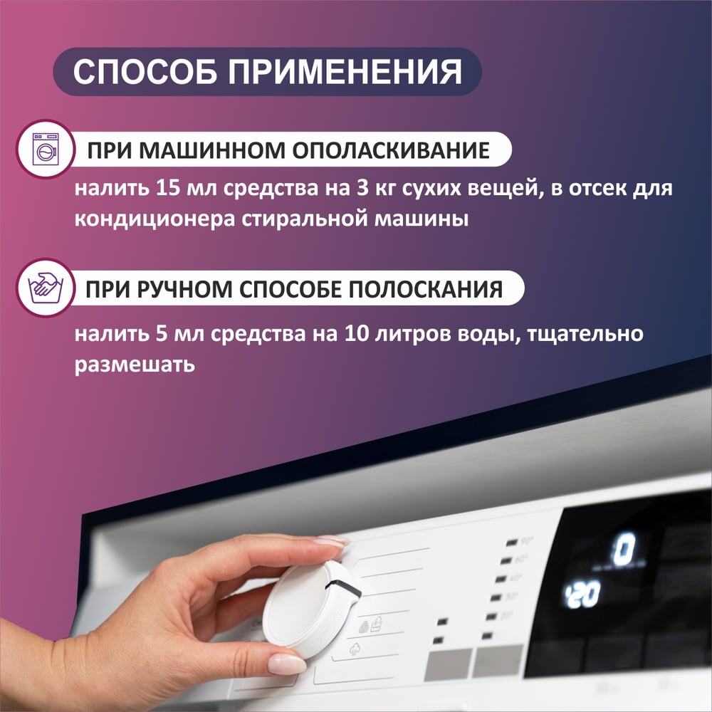 | Состав | 30% вода очищенная, 5%, но <30% катионные ПАВ, 5% ароматизирующая добавка, консервант, поликатионные полимеры более 1%. |