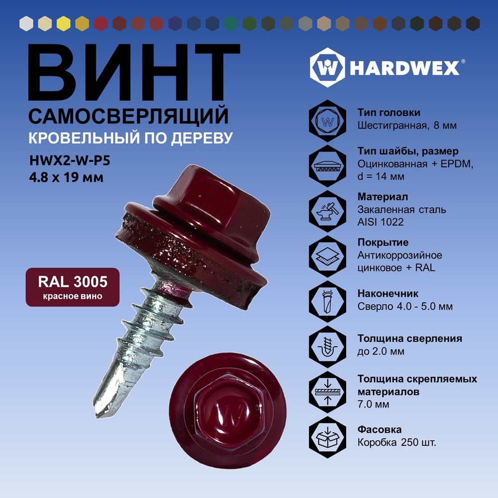 Саморез кровельный по дереву HARDWEX ТМ HWX2-W-P5-4.8x19 мм, св.№1, RAL 3005, 250 шт. 5190000000829