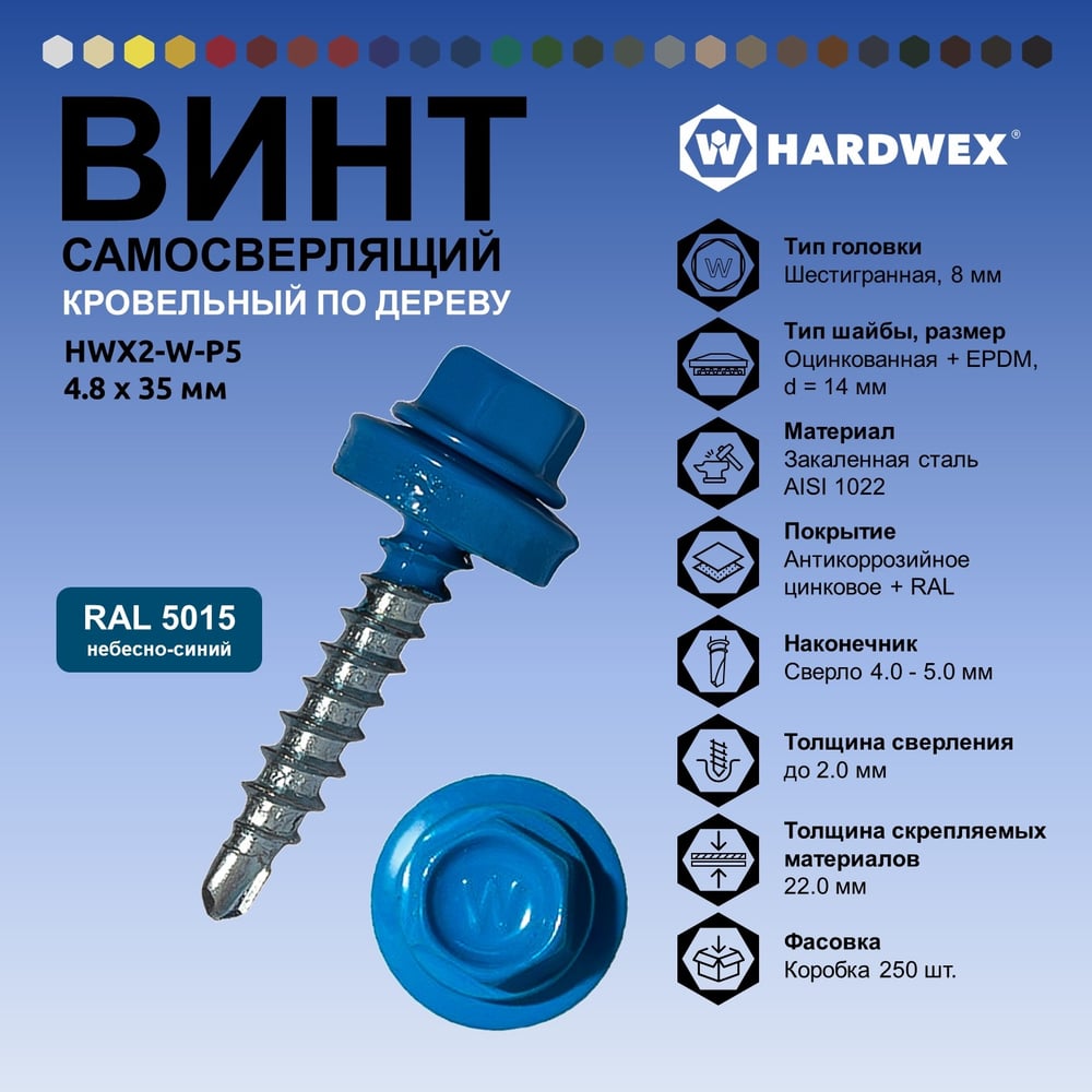 Саморез кровельный по дереву HARDWEX ТМ HWX2-W-P5-4.8x35 мм, св.№1, RAL 5015, 250 шт. 5190000002069
