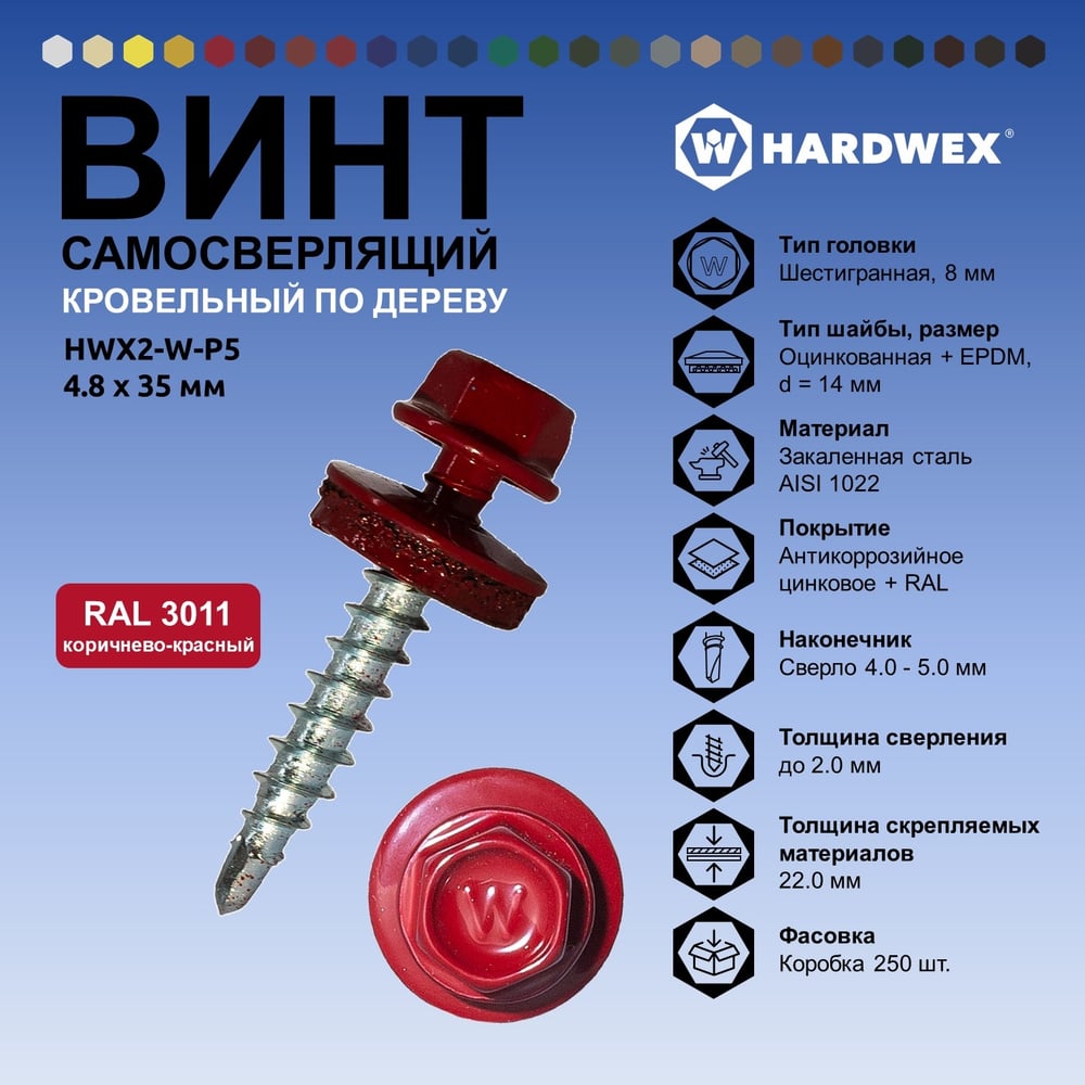 Саморез кровельный по дереву HARDWEX ТМ HWX2-W-P5-4.8x35 мм, св.№1, RAL 3011, 250 шт. 5190000002021