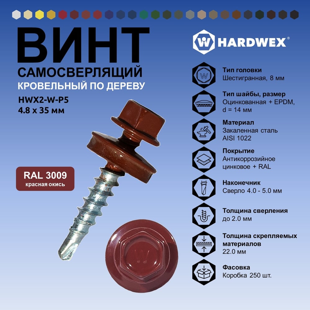 Саморез кровельный по дереву HARDWEX ТМ HWX2-W-P5-4.8x35 мм, св.№1, RAL 3009, 250 шт. 5190000002014