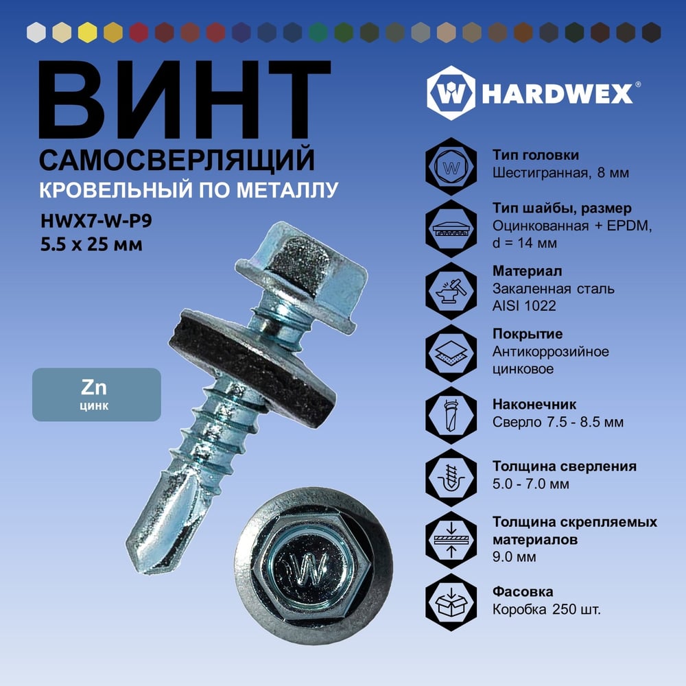 Саморез кровельный по металлу HARDWEX ТМ HWX7-W-P9-5.5x25 мм, св.№3, цинк, 250 шт. 5190000023774