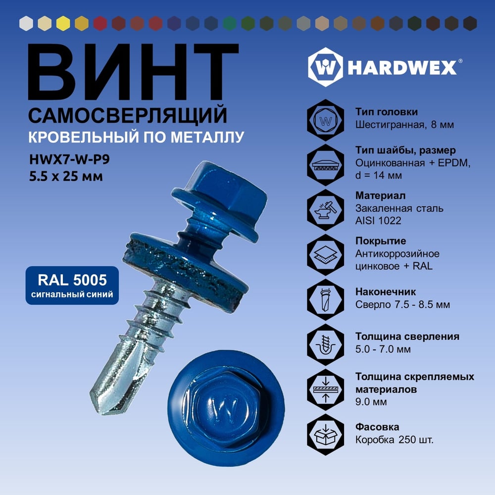 Саморез кровельный по металлу HARDWEX ТМ HWX7-W-P9-5.5x25 мм, св.№3, RAL 5005, 250 шт. 5190000023897