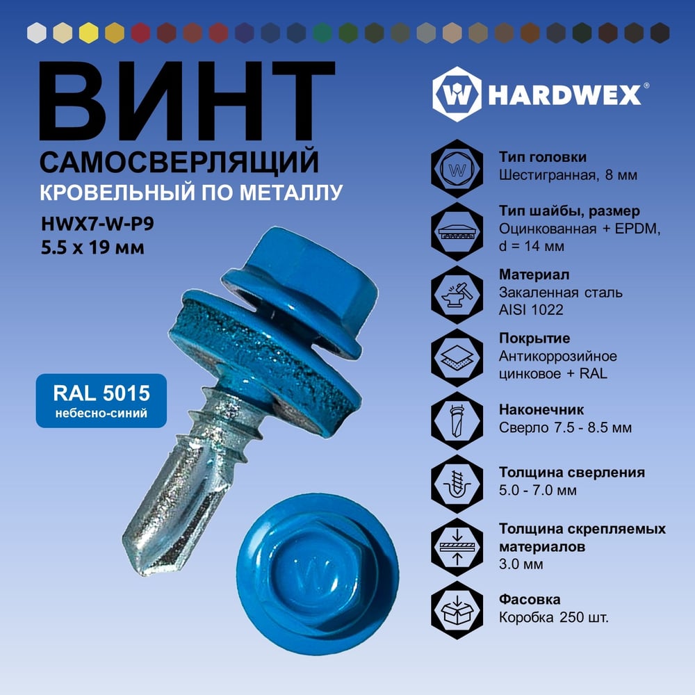 Саморез кровельный по металлу HARDWEX ТМ HWX7-W-P9-5.5x19 мм, св.№3, RAL 5015, 250 шт. 5190000023613